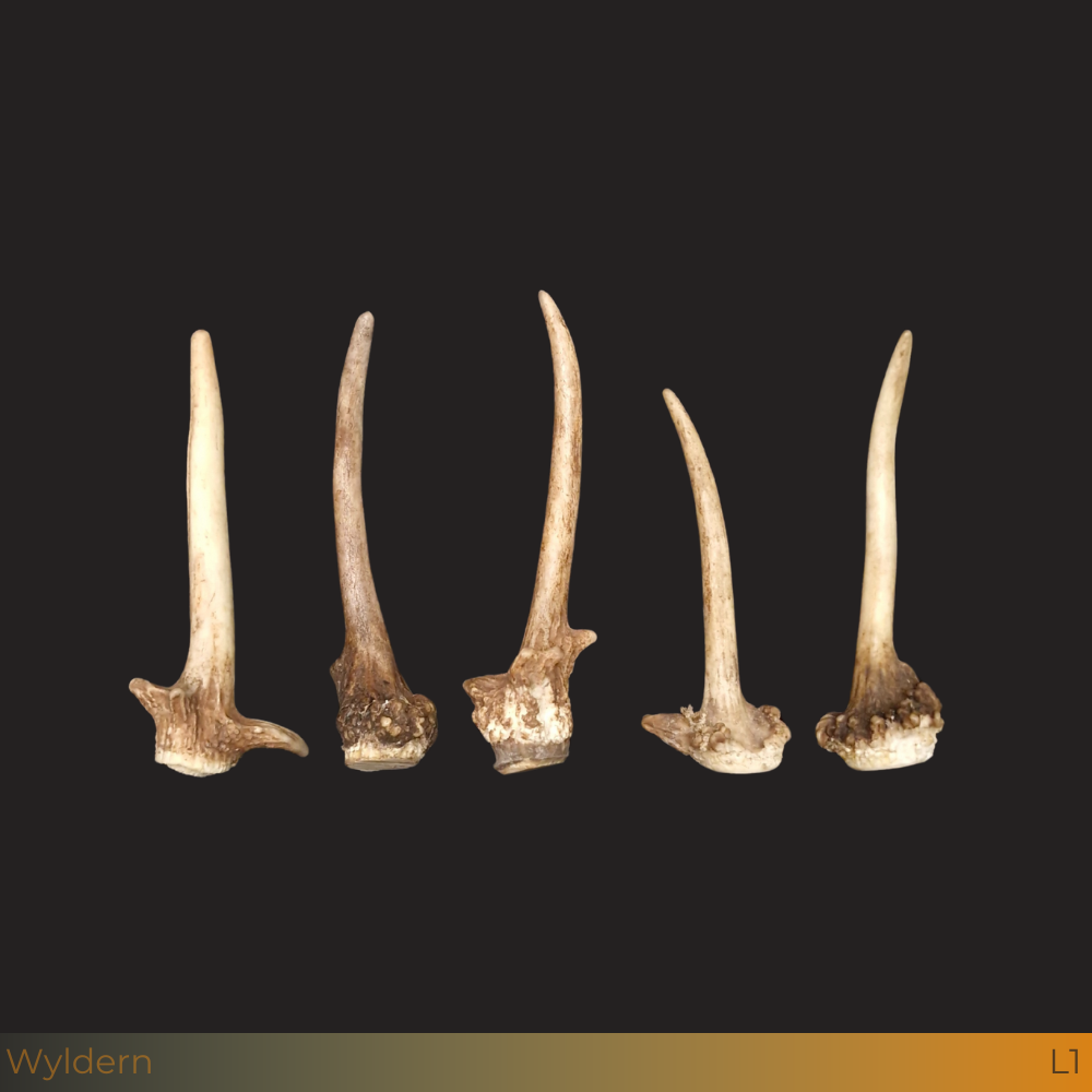 Vijf echte spitser stangen van damhert , variërend in lengte van 15 tot 20 cm. Perfect als stijlvolle decoratie. Authentiek, karaktervol en ideaal voor een landelijke of rustieke inrichting.