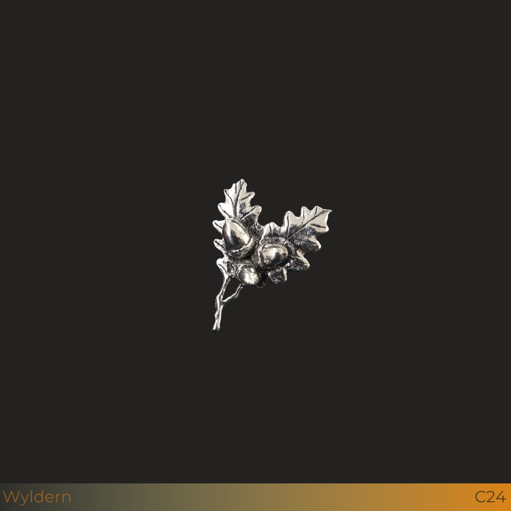 Een handgemaakte tinnen pin van een Eikenbladeren, voorzien van een stevige vlindersluiting. Een stijlvol accessoire met oog voor detail het is perfect voor op de jas, pet, hoed of rugzak.