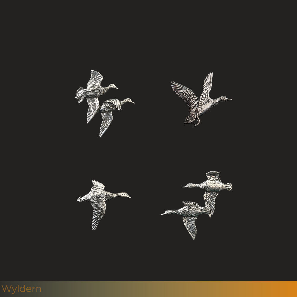 Handgemaakte tinnen pins van Wilde eenden, afgewerkt met een stevige vlindersluiting. Een stijlvol accessoire met oog voor detail het is perfect voor op de jas, pet, hoed of rugzak.