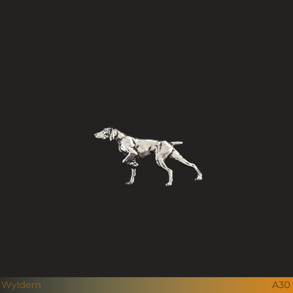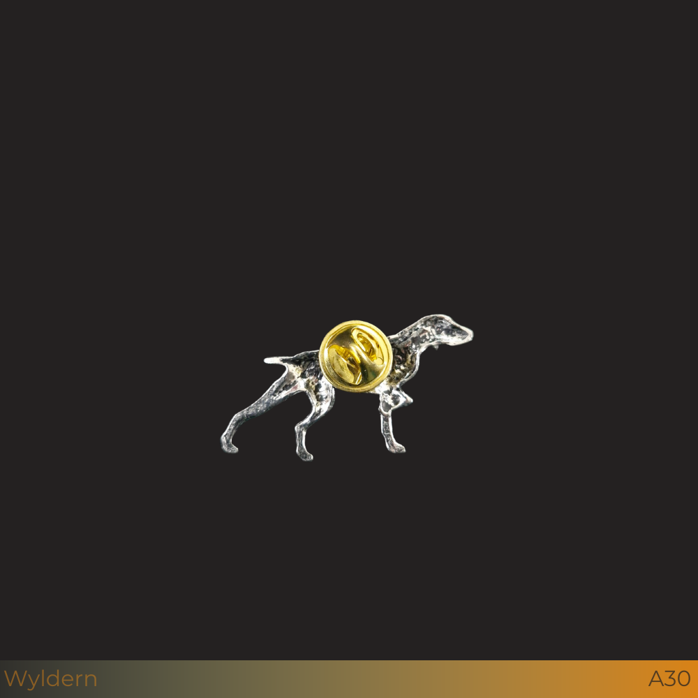 Een handgemaakte tinnen pin van een Pointer, voorzien van een stevige vlindersluiting. Een stijlvol accessoire met oog voor detail het is perfect voor op de jas, pet, hoed of rugzak.